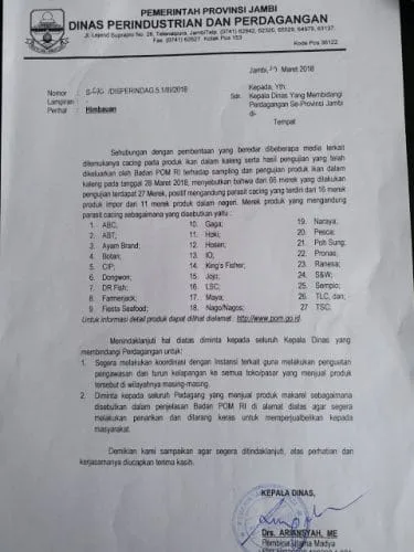 Temuan ini disampaikan oleh Kepala Dinas Perindustrian dan Perdagangan Provinsi Jambi, Drs Ariansyah ME lewat surat imbauan tertanggal 29 Maret 2018 kepada seluruh Kepala Dinas yang membidangi Perdagangan se-Provinsi Jambi.
