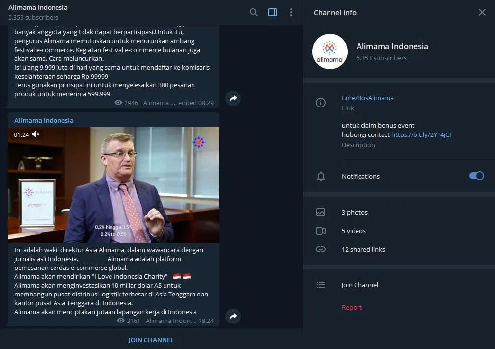 “Alimama adalah platform pemesanan cerdas e-commerse global. Alimama akan mendirikan I Love Indonesia Charity. Alimama akan menginvestasikan 10 miliar dolar AS untuk membangun pusat distribusi logistik terbesar di Asia Tenggara dan kantor pusat Asia Tenggara di Indonesia. Alimama akan menciptakan jutaan lapangan kerja di Indonesia.” tulis akun telegram @BosAlimama.