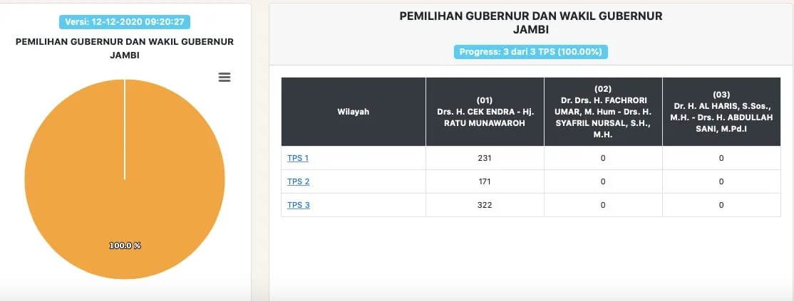Informasi ini didapatkan langsung dari website KPU yang tengah menginput data real suara per TPS dalam Pilgub Jambi 2020. Cek di sini: https://pilkada2020.kpu.go.id/#/pkwkp/tungsura/1503062008