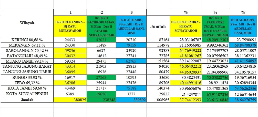 Tiga wilayah tersebut yakni, Kota Jambi dengan 53,56%, Muaro Jambi dengan 41,41% dan terakhir kabupaten Merangin dengan angka yang fantastis yaitu 68,84% unggul jauh dari CE-Ratu yang hanya meraup 21,16% dan Fachrori-Syahril dengan 9,99% saja.