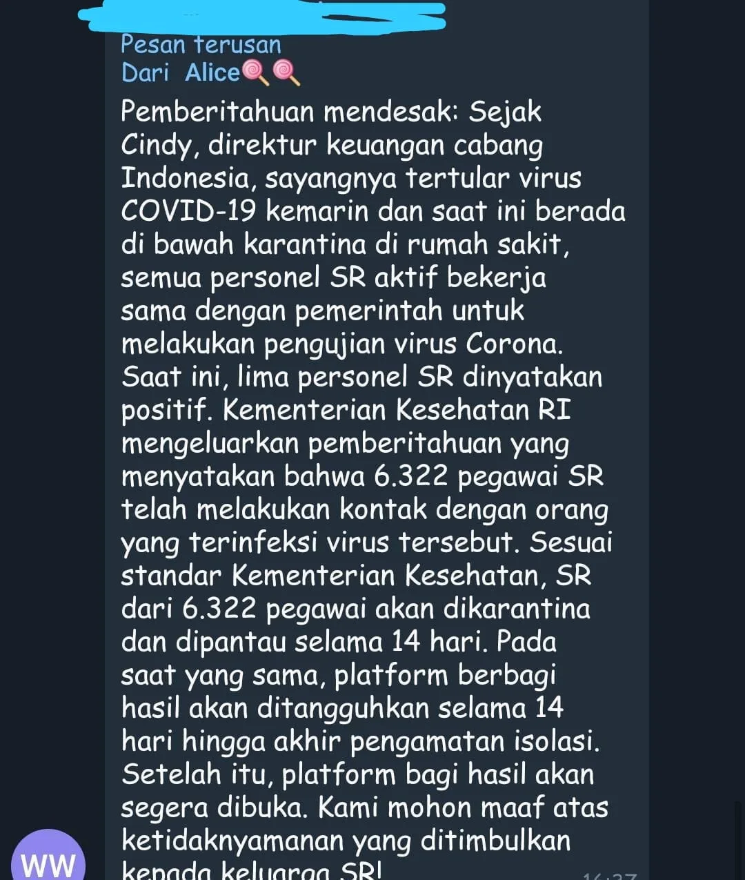 “Pemberitahuan Mendesak: Sejak Cindy, direktur keuangan cabang Indonesia, sayangnya tertular virus COVIDS-19 kemarin dan saat ini berada di bawah karantina di rumah sakit, semua personel SR aktif bekerja sama dengan pemerintah untuk melakukan pengujian virus Corona.
