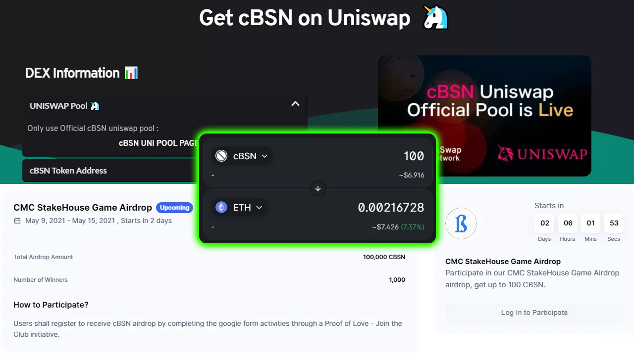 Airdrop yang diberikan untuk satu orang adalah 100 CBSN atau sekitar 7 USD, lumayan bukan?