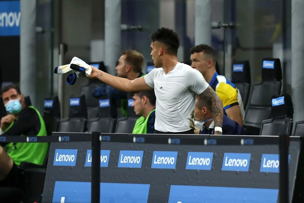 Lautaro bergumam kesal dan menendang botol di pinggir lapangan. Tak tinggal diam, sang pelatih justru murka dan meneriakkan sesuatu kepada Martinez.