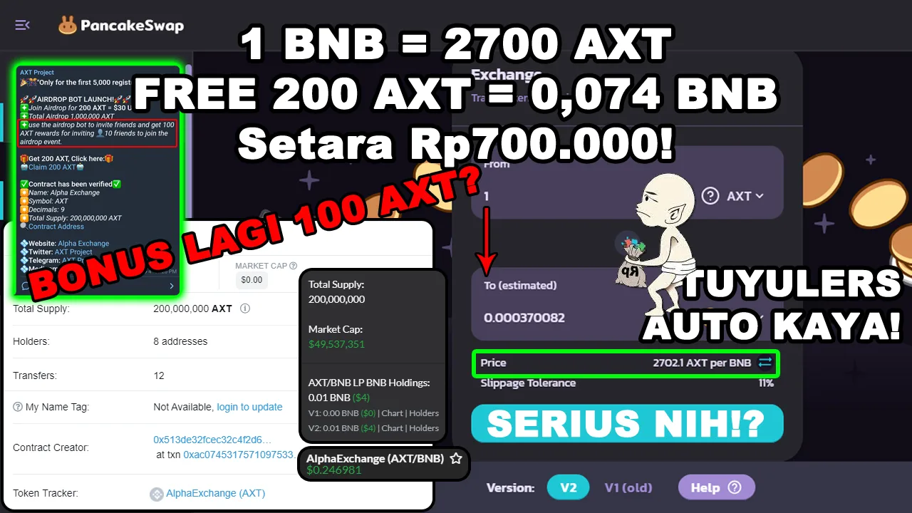 Kali ini situs Alpha Exchange mengadakan Event Airdrop dan sepertinya event airdrop tersebut sudah berjalan dari minggu lalu, Event Airdrop ini membagikan 200 token untuk setiap pengguna yang bergabung dan jika dihitung 200 token yang dibagikan adalah senilai 45 USD hingga 50 USD jika dilihat dari alamat kontrak token tersebut di poocoin.app harga 1 tokennya adalah 0,249 USD.