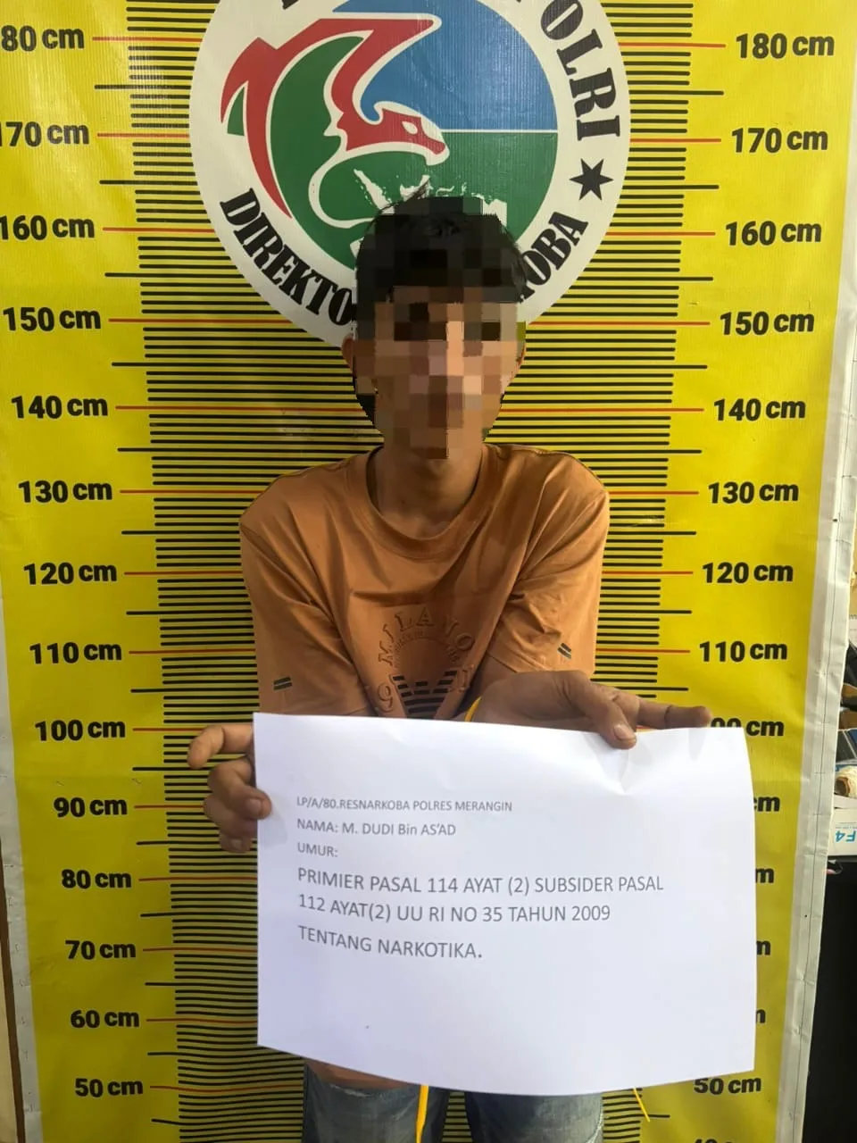 Berbekal informasi tersebut, Kasat Resnarkoba Polres Merangin AKP Rezi Darwis SH MM langsung memerintahkan Tim Opsnal untuk melakukan penyelidikan. Tepatnya pada Jumat, 12 Desember 2025 sekira pukul 01.00 WIB, Tim berhasil mengamankan seorang terduga pelaku berinisial MD (27) saat dalam perjalanan tepatnya di jalan Desa Langling, Kecamatan Bangko, Kabupaten Merangin.