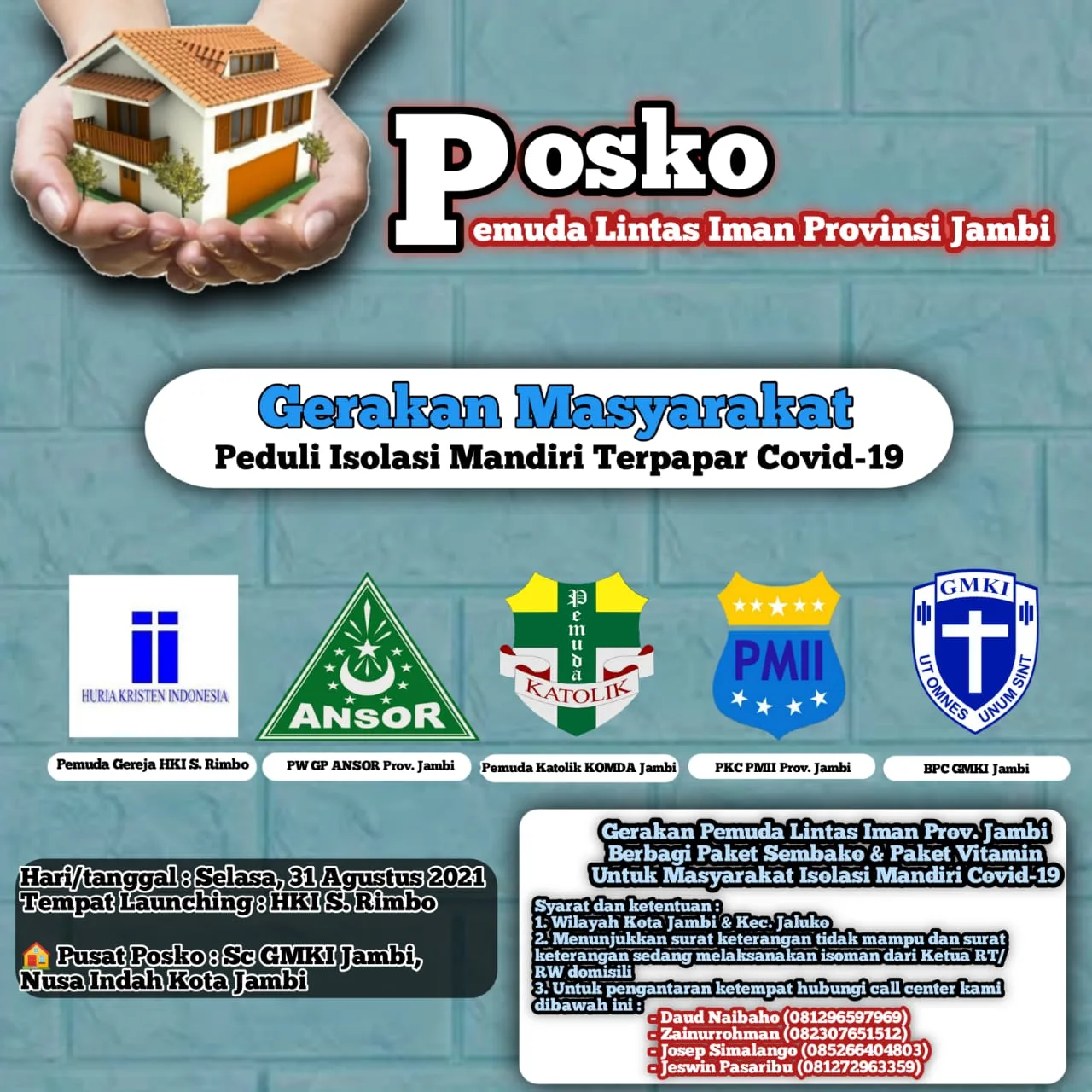 Hal ini menarik perhatian dari sejumlah Organisasi Kepemudaan (OKP) lintas agama seperti GMKI Jambi, PKC PMII Jambi, PW Ansor Provinsi Jambi, dan Pemuda Katolik KOMDA Jambi yang tergabung dalam Gerakan Masyarakat Peduli Isolasi Mandiri untuk menginisiasi posko pelayanan yang bertujuan membantu pemerintah dalam memutus rantai penyebaran virus Covid-19 di Kota Jambi.