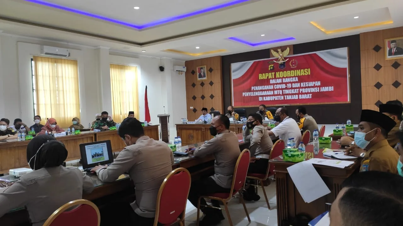 DETAIL.ID, Kualatungkal – Bupati Tanjungjabung Barat, Drs H. Anwar Sadat, M. Ag bersama Kapolda Jambi ikuti rapat koordinasi penangan Covid-19 jelang penyelengaraan MTQ ke 50 tingkat Provinsi Jambi.