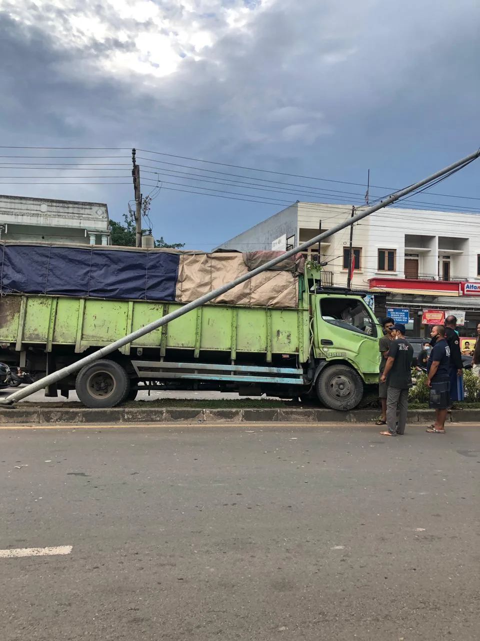 “Mobil truk batu bara om, nabrak tiang listrik. Tiang listriknya penyok. Bagian depan truk lecet-lecet. Kondisi truknya ini di tergantung di pembatas jalan. Sempat macet lah tadi bentar,” kata Eldo salah satu penggunaan jalan.