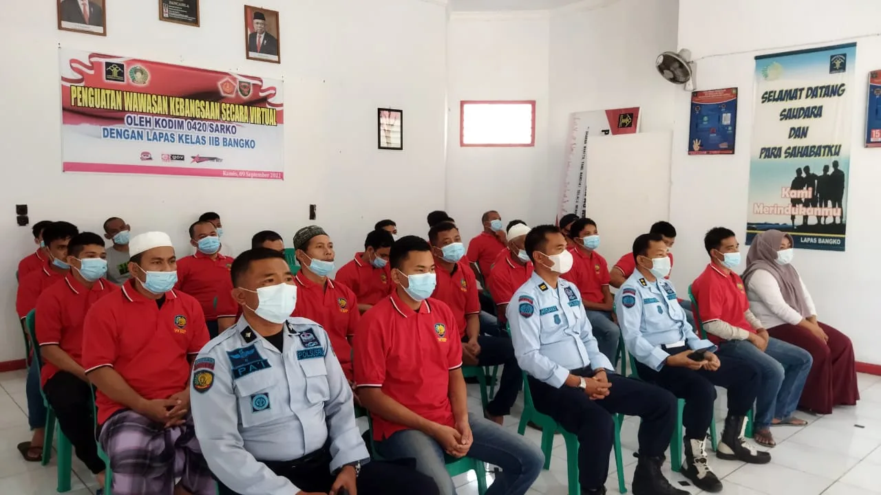 Kegiatan ini dilaksanakan secara virtual dengan melalui aplikasi zoom mengingat kondisi pandemik covid 19 di Aula Lapas Bangko serta di kodim 0420 Sarko, namun demikin warga binaan Lapas secara antusias mengikuti acara tersebut.