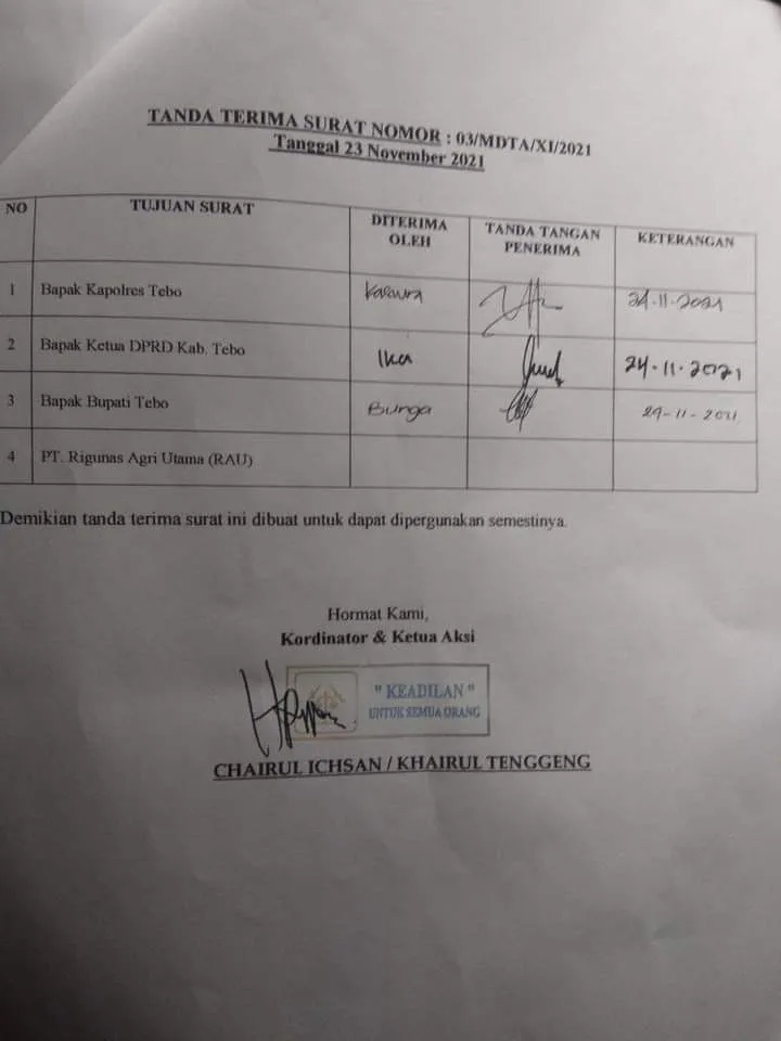 DETAIL.ID, Tebo – Masyarakat Desa Tanjung Aur Kecamatan Tebo Ulu Kabupaten Tebo yang tergabung di dalam Aliansi Keadilan Untuk Semua Orang direncanakan akan melakukan Aksi Demonstrasi, Kamis 25 November 2021.