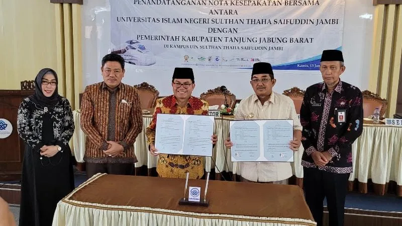 Kerjasama ditandai dengan ditandatangai Nota Kesepahaman (MoU) antara Bupati Tanjab Barat Drs. KH. Anwar Sadat, M.Ag dengan Prof. Dr. H. Suaidi Asyari, MA, Ph.D di Gedung Rektorat UIN Jambi, Kamis 13 Januari 2022.