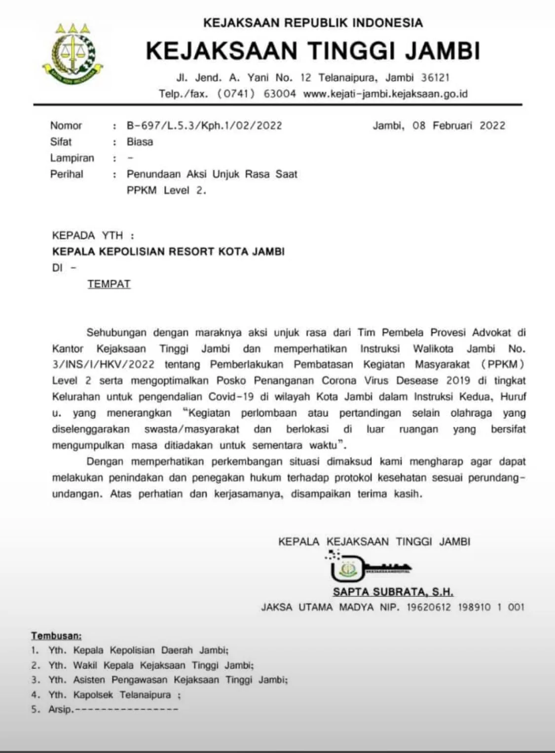 “Sehubungangan dengan maraknya aksi unjuk rasa dari Tim Pembela Provesi Advokat di kantor Kejaksaan Tinggi Jambi dan memperhatikan instruksi walikota Jambi No.3/INS/I/HKV/2022 tentang Pemberlakuan Pembatasan Kegiatan Masyarakat Level 2 serta mengoptimalkan posko penanganan Corona Virus Desease 2019 di tingkat kelurahan untuk pengendalian covid 19 di wilayah kota Jambi dalam instruksi kedua huruf u yang menerangkan “kegiatan perlombaan atau pertandingan selain olahraga yang diselenggarakan swasta/masyarakat dan berlokasi di luar ruangan yang bersifat mengumpulkan massa ditiadakan untuk sementara waktu,” tulis pihak Kejati Jambi dalam surat tersebut.
