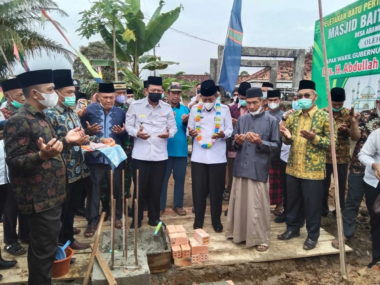 DETAIL.ID, Muarojambi – Wakil Bupati Muaro Jambi, Bambang Bayu Suseno, SP., MM., M. Si mendampingi Wakil Gubernur Jambi, Drs. H. Abdullah Sani., M. Pd. I menghadiri Acara Peletakkan Batu Pertama Pembangunan Masjid Baitussalam Desa Arang-Arang, bertempat di Desa Arang-Arang, Kecamatan Kumpeh Ulu Kabupaten Muaro Jambi.