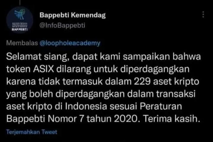 “Dapat kami sampaikan bahwa token ASIX dilarang untuk diperdagangkan karena tidak termasuk dalam 229 aset kripto yang boleh diperdagangkan dalam transaksi aset kripto di Indonesia sesuai Peraturan Bappebti Nomor 7 tahun 2020,” tulis Bappebti melalui akun Twitter @InfoBappebti pada Kamis, 10 Februari 2022.