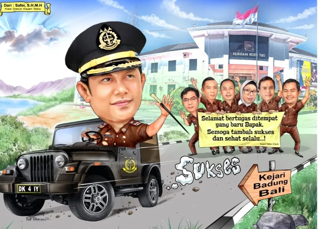 Sementara, di sisi belakang tampak para Kepala Seksi (Kasi) berdiri di depan kantor Kejari Tebo sambil melambaikan tangan. Tampak spanduk bertuliskan “Selamat bertugas di tempat yang baru Bapak, semoga tambah sukses dan sehat selalu” ini menunjukkan walaupun berat namun mereka ikhlas mengantar kepergian Imran Yusuf untuk mengemban tugas di tempat yang baru.