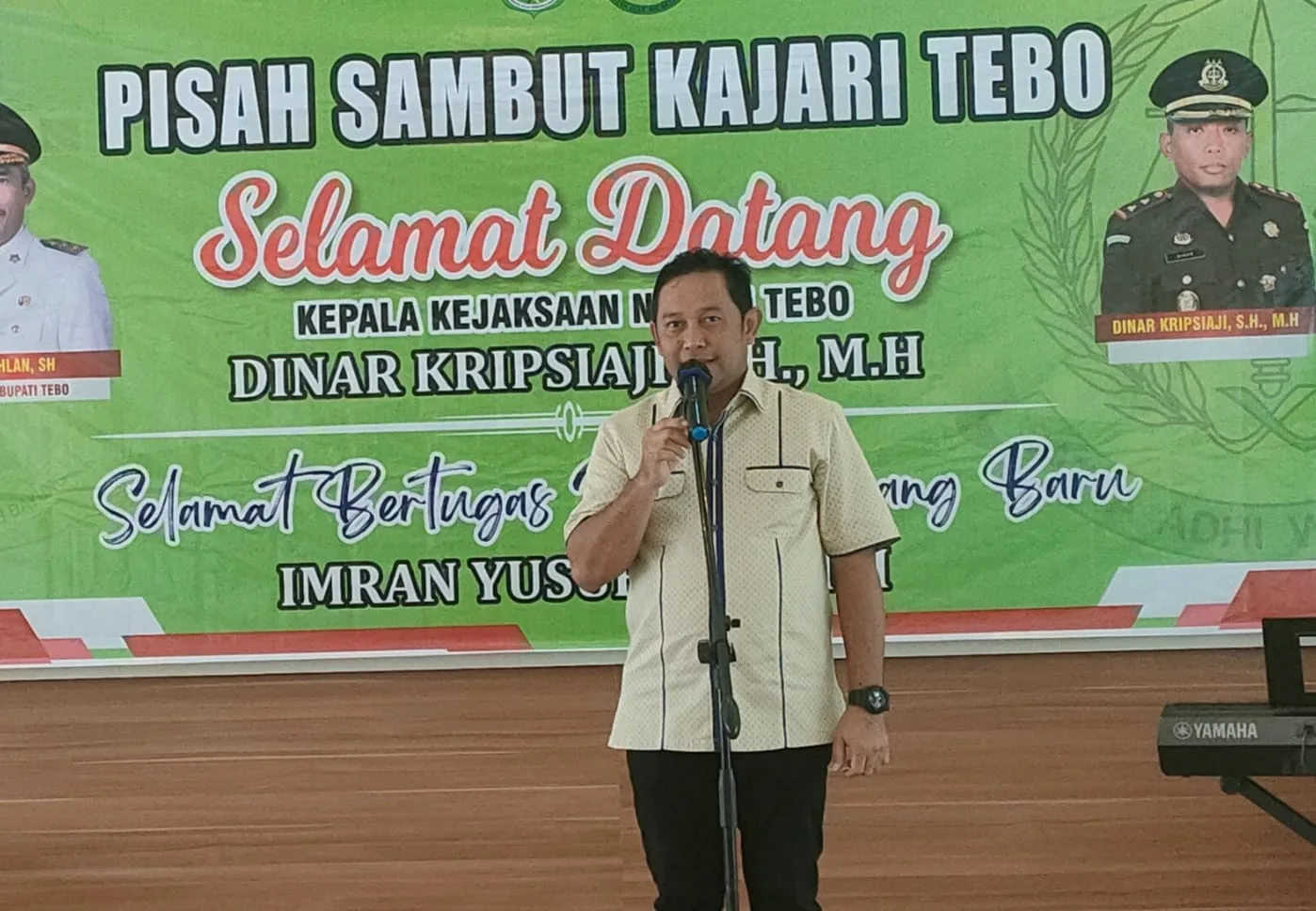Kajari Tebo, Dinar Kripsiaji berkata, sudah dua hari ini dia mendengarkan cerita tentang Kabupaten Tebo dari Imran Yusuf. Semua cerita yang disampaikan baik semua. “Alhamdulillah saya bisa berdiri di sini sebagai Kajari Tebo menggantikan Imran Yusuf,” katanya.
