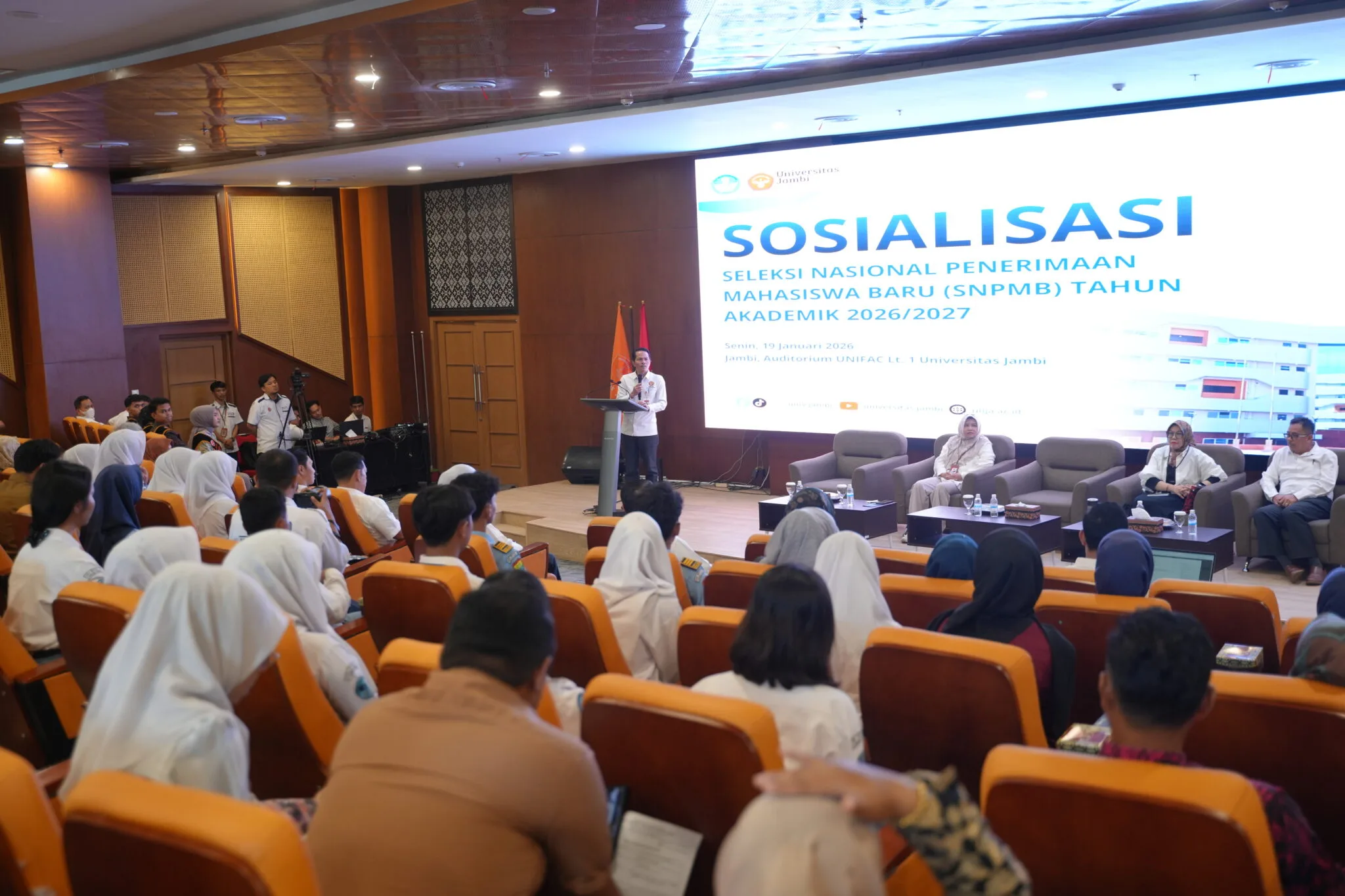 Mendalo – Universitas Jambi (UNJA) menggelar kegiatan Sosialisasi Seleksi Nasional Penerimaan Mahasiswa Baru (SNPMB) Tahun 2026 di Auditorium Lantai 1 Gedung UNIFAC, UNJA Mendalo pada Senin, 19 Januari 2026 .