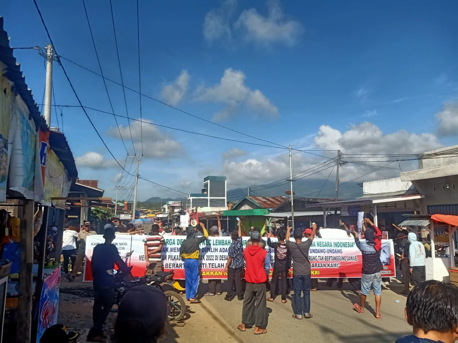 Ratusan massa ini membentangkan spanduk dengan tulisan “Kami warga Desa Tuo Kecamatan Lembah Masurai Provinsi Jambi. Kami warga Negara Indonesia, hak Memilih dan dipilih adalah hak konstitusional dilindungi undang-undang, membatalkan Pilkades serentak 2022 di Desa Tuo demi kepentingan elit dan sekelompok orang tak bertanggung jawab. Berarti Bupati telah mengabaikan status kewarganegaraan kami”.