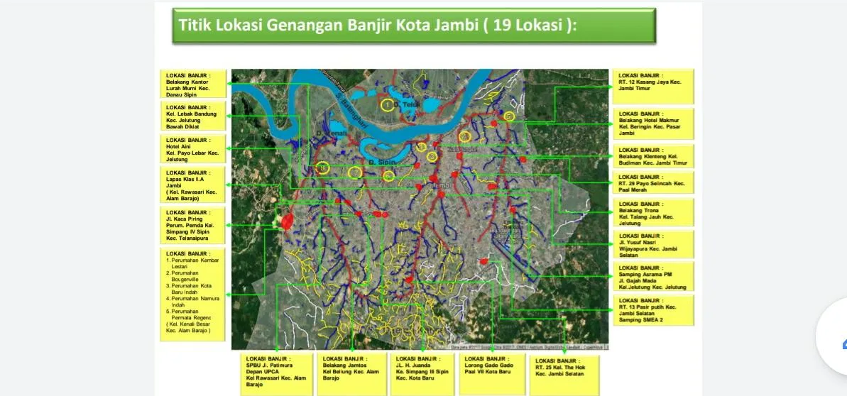 Titik genangan ini berhubungan satu dengan yang lain. Akibat satu titik yang bermasalah maka akan berpengaruh ke titik lainnya. Berikut ini 19 titik lokasi genangan banjir di Kota Jambi.