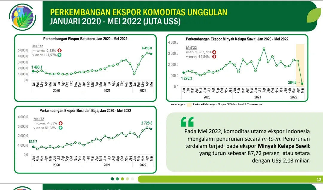 Kondisi paling parah baik secara bulanan maupun tahunan terjadi pada sektor ekspor minyak kelapa sawit. Pada bulan Mei saja, Indonesia sudah kehilangan USD 2,03 miliar atau Rp 30,04 triliun atau turun sebesar 87,72 persen dari bulan April.