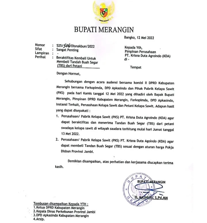 DETAIL.ID, Merangin – PT Krisna Duta Agroindo (KDA) di Kabupaten Merangin, Jambi tampaknya tidak benar-benar berkomitmen penuh dalam melaksanakan kesepakatan yang dihasilkan saat audiensi bersama Komisi II DPRD Merangin, Pemkab setempat, dan DPD Apkasindo Merangin pada 12 Mei 2022 lalu.