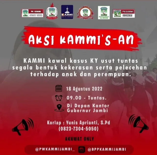 “Kita melihat pengusutan kasus KY ini dilematis, hampir satu bulan tidak ada kemajuan, bahkan terdangka saja belum ditetapkan,” kata Kabid Perempuan KAMMI Wilayah Jambi, Novita Sari, Rabu 17 Agustus 2022 lewat pesan tertulisnya.