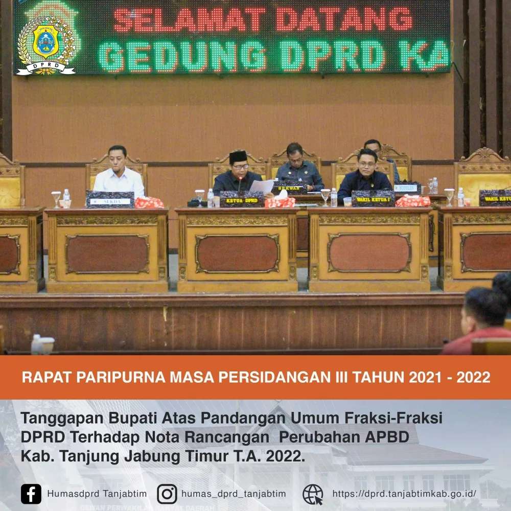 DETAIL.ID,Tanjungjabung Timur – Dewan Perwakilan Rakyat Daerah (DPRD) Kabupaten Tanjungjabung Timur dalam rapat paripurna masa persidangan I tahun 2022-2023 dengan agenda penyampaian Tanggapan Bupati atas pandangan umum Fraksi DPRD terhadap Nota Rancangan Perubahan APBD Kabupaten Tanjungjabung Timur Tahun Anggaran 2022.