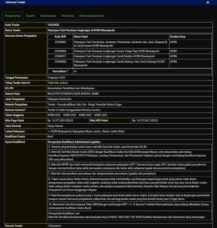 Kepada awak media sumber yang meminta untuk tak disebutkan identitasnya itu mengungkap salah satu kegiatan lelang yang dilakukan oleh Balai KCBN Provinsi Jambi. Diduga terdapat permainan demi meloloskan peserta dengan melabrak prosedur dalam proses lelang pekerjaan fisik penataan lingkungan di KCBN Muarojambi.