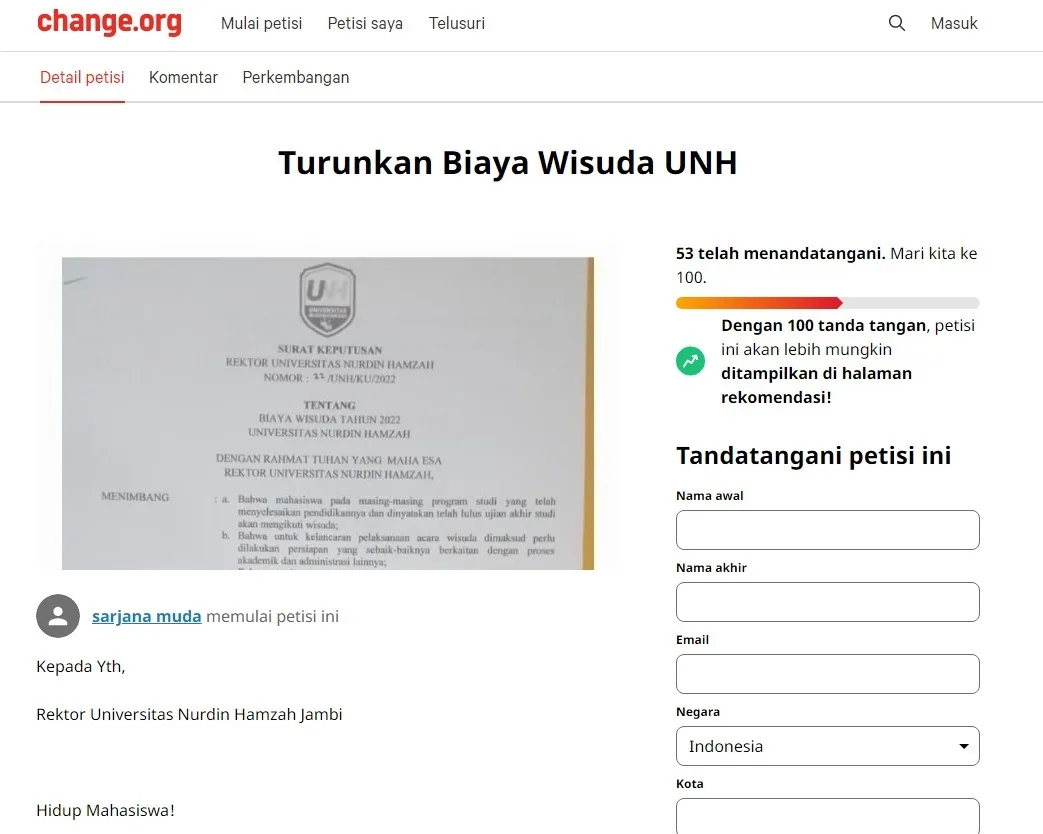 detail.id/, Jambi – Beredar petisi online dari Wisudawan Universitas Nurdin Hamzah Jambi. Petisi tersebut memuat tuntutan kepada Rektor UNH untuk menurunkan biaya wisuda tahun 2022.