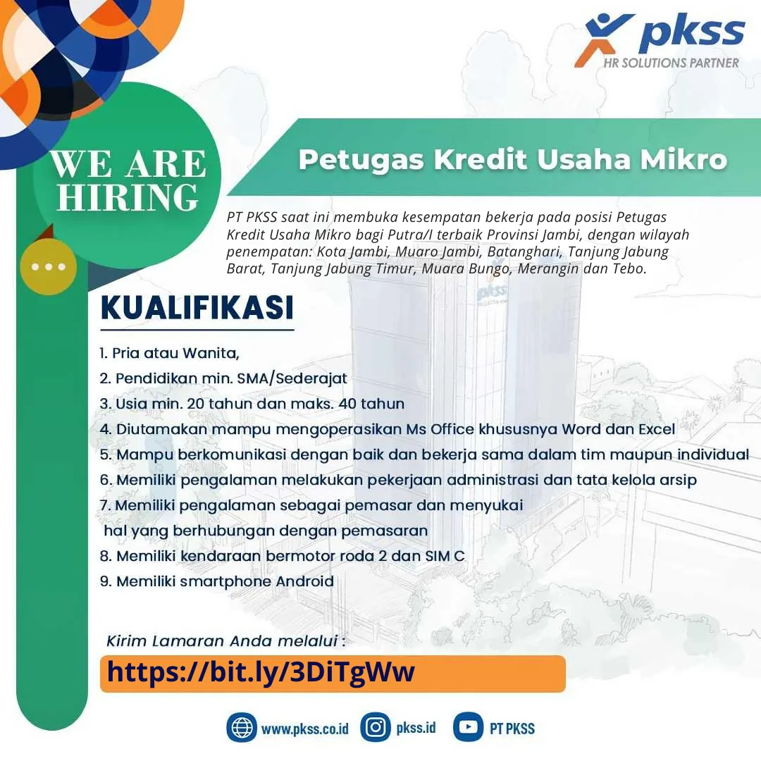 Periode November 2022 ini, PT PKSS membuka 38 formasi lowongan Petugas Kredit Usaha Mikro bagi putra/I terbaik Provinsi Jambi. Adapun wilayah penempatan Petugas Kredit Usaha Mikro, tersebar di 8 Kabupaten/kota yakni, Kota Jambi, Muarojambi, Batanghari, Tanjungjabung Barat, Tanjung Jabung Timur, Sarolangun, Merangin dan Tebo.