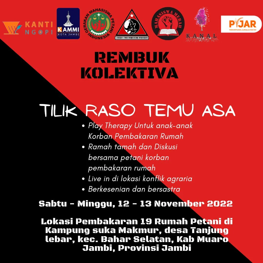 detail.id/, Jambi –Rembuk Kolektiva yang terdiri dari KAMMI Kota Jambi, Gema Petani Jambi, LSMM Jambi, KANAL, Mahasiswa Merah, PIJAR Jambi dan Kanti Ngopi mengecam tindakan pembakaran rumah petani yang terjadi Kampung Suka Makmur, Desa Tanjung Lebar, Kecamatan Bahar Selatan, Kabupaten Jambi.