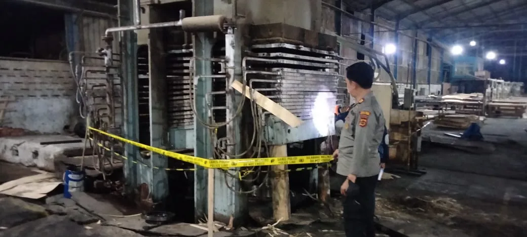 Seorang pelajar SMKN 1 Muarojambi yang sedang melaksanakan kegiatan praktek di pabrik milik PT Sumber Graha Sejahtera (SGS) terjepit mesin Hot Press atau mesin press triplek.