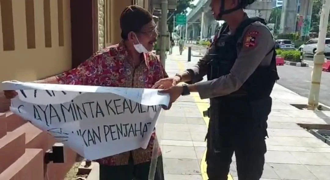 Pria tersebut membawa kertas karton bertuliskan: Pak Kapolri, Saya Minta Keadilan, Saya Bukan Penjahat.