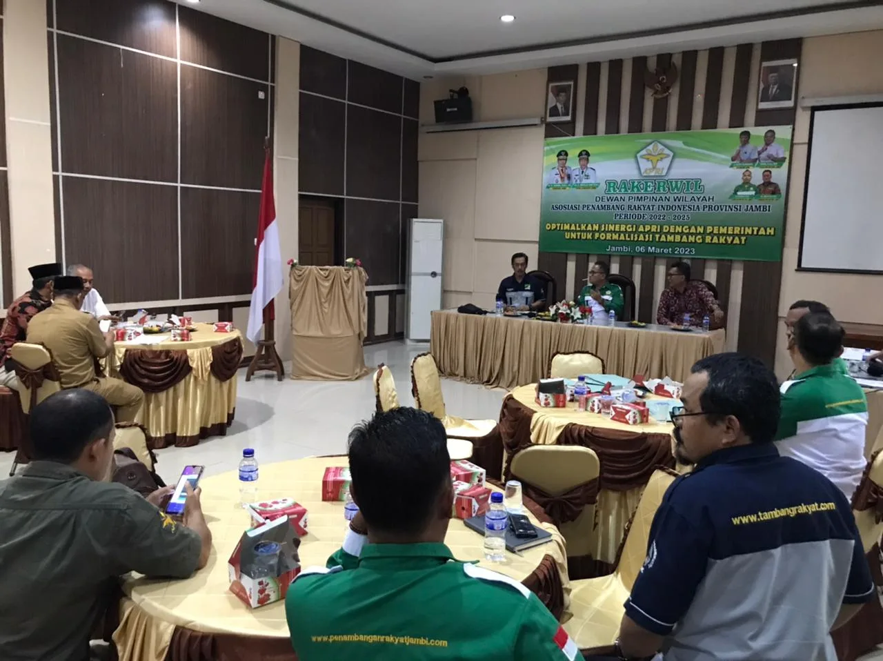 Jambi – Dewan Pimpinan Wilayah (DPW) Asosiasi Penambang Rakyat Indonesia (APRI) Provinsi Jambi menggelar Rapat Kerja Wilayah dengan mengusung tema “Optimalkan Sinergi APRI dengan Pemerintah untuk Formalisasi Tambang Rakyat” pada Senin, 6 Maret 2023 di Aula Kesbangpol Provinsi Jambi.