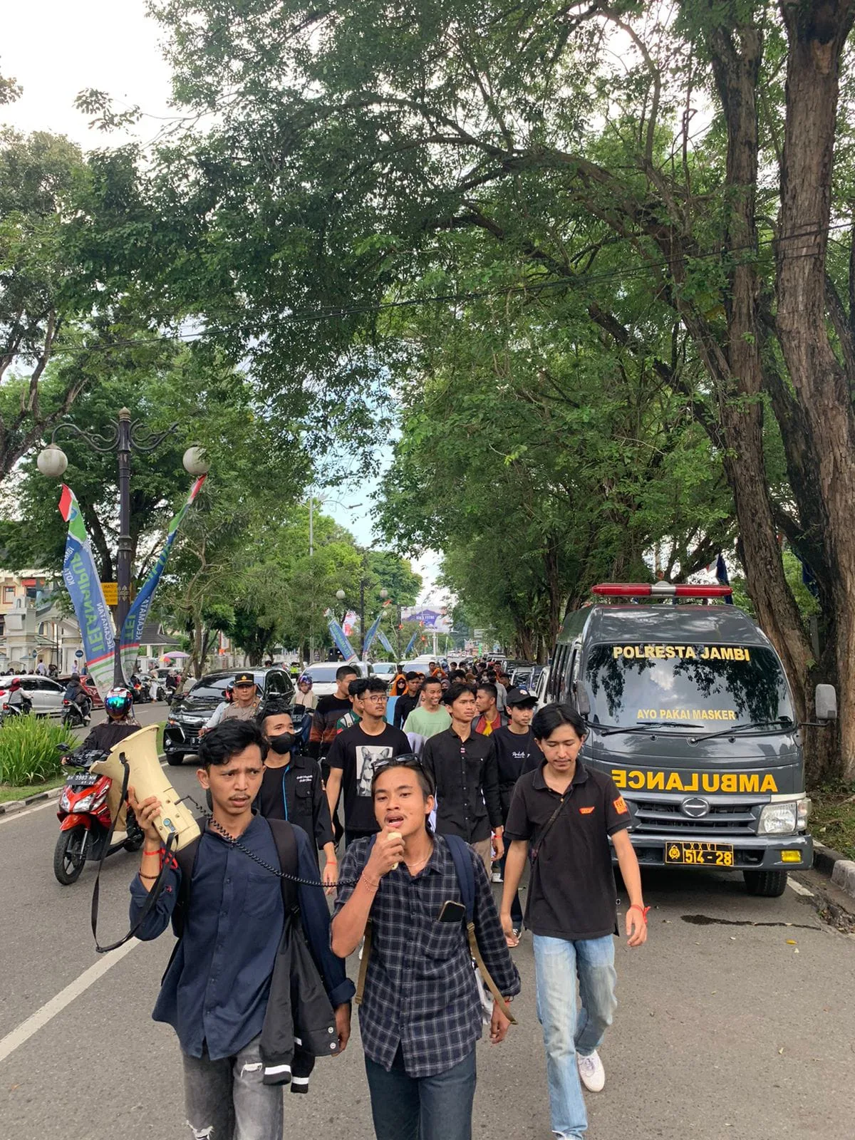Aksi damai yang melibatkan puluhan mahasiswa itu dimulai dengan orasi di Simpang BI, Kecamatan Telanaipura, Kota Jambi, dan dilanjutkan orasi di depan gedung Kejati Jambi, Senin.