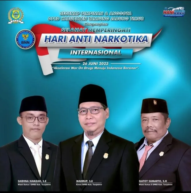 “Peringatan HANI juga dilakukan sebagai bentuk keprihatinan dunia terhadap korban penyalahgunaan narkotika sekaligus wujud perlawanan terhadap salah satu kejahatan luar biasa (extraordinary crime) yang menjadi tantangan kita kedepan, dan menjadi momentum bagi kita untuk meningkatkan kesadaran akan masalah utama yang ditimbulkan oleh narkotika,” ujar Ketua DPRD Tanjab Timur, Mahrup.