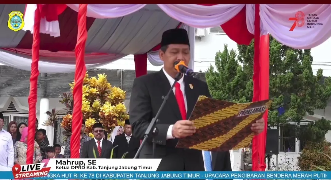 Tanjungjabung Timur – Ketua Dewan Perwakilan Rakyat Daerah (DPRD) Kabupaten Tanjungjabung Timur, Mahrup, SE membacakan teks proklamasi saat upacara kenaikan bendera dalam upacara peringatan HUT Ke-78 Republik Indonesia di halaman perkantoran Bupati Tanjungjabung Timur, Kamis, 17 Agustus 2023.