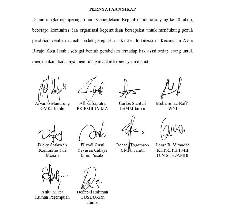 Dalam rangka memperingati hari Kemerdekaan Republik Indonesia yang ke-78 tahun, beberapa komunitas dan organisasi kepemudaan bersepakat untuk mendukung penuh pendirian kembali rumah ibadah gereja Huria Kristen Indonesia (HKI) Alam Barajo di Kecamatan Alam Barajo Kota Jambi, sebagai bentuk pembelaan terhadap hak asasi setiap orang untuk menjalankan ibadahnya menurut agama dan kepercayaan dianut.