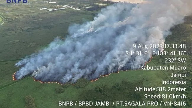 Sebelumnya diberitakan, kebakaran lahan kembali terjadi di Jambi Rabu 9 Agustus 2023 sekitar pukul 17.00 WIB. Kali ini terjadi di Desa Talang Duku, Kabupaten Muaro Jambi, Jambi.
