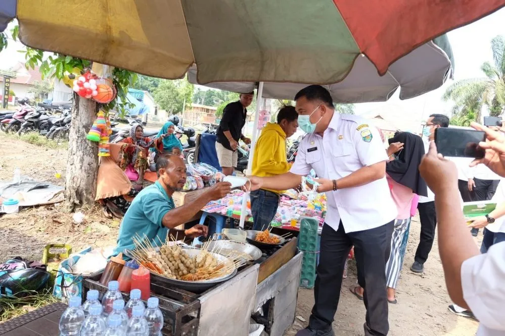 Sekretaris Daerah Kabupaten Muarojambi Budhi Hartono, S.Sos., MT didampingi Kepala Dinas Kesehatan Muaro Jambi H. Afif Udin, SKM., M.Kes serta Kepala OPD lingkup Pemkab Muarojambi berikan ratusan masker ke masyarakat di Kelurahan Pijoan, Kecamatan Jambi Luar Kota (Jaluko), pada Rabu, 6 September 2023.