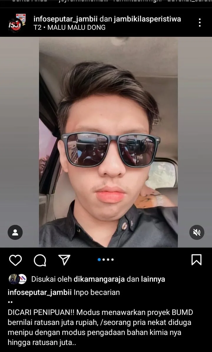 DETAIL.ID, Jambi – Media sosial warganet Jambi diramaikan dengan dugaan kasus penipuan dengan modus menawarkan proyek BUMD bernilai ratusan juta rupiah sebagaimana dilihat dalam postingan akun Instagram @infoseputar_jambii dan @jambikilasperistiwa, Sabtu 16 September 2023.