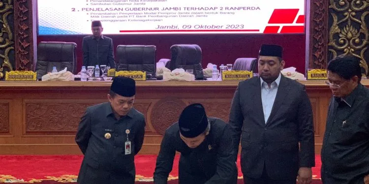 Pada kesempatan ini, juga dilakukan penandatangan antara DPRD Provinsi Jambi dalam hal ini pimpinan DPRD Provinsi Jambi bersama dengan Pemerintah Provinsi Jambi dalam hal ini Gubernur Jambi.