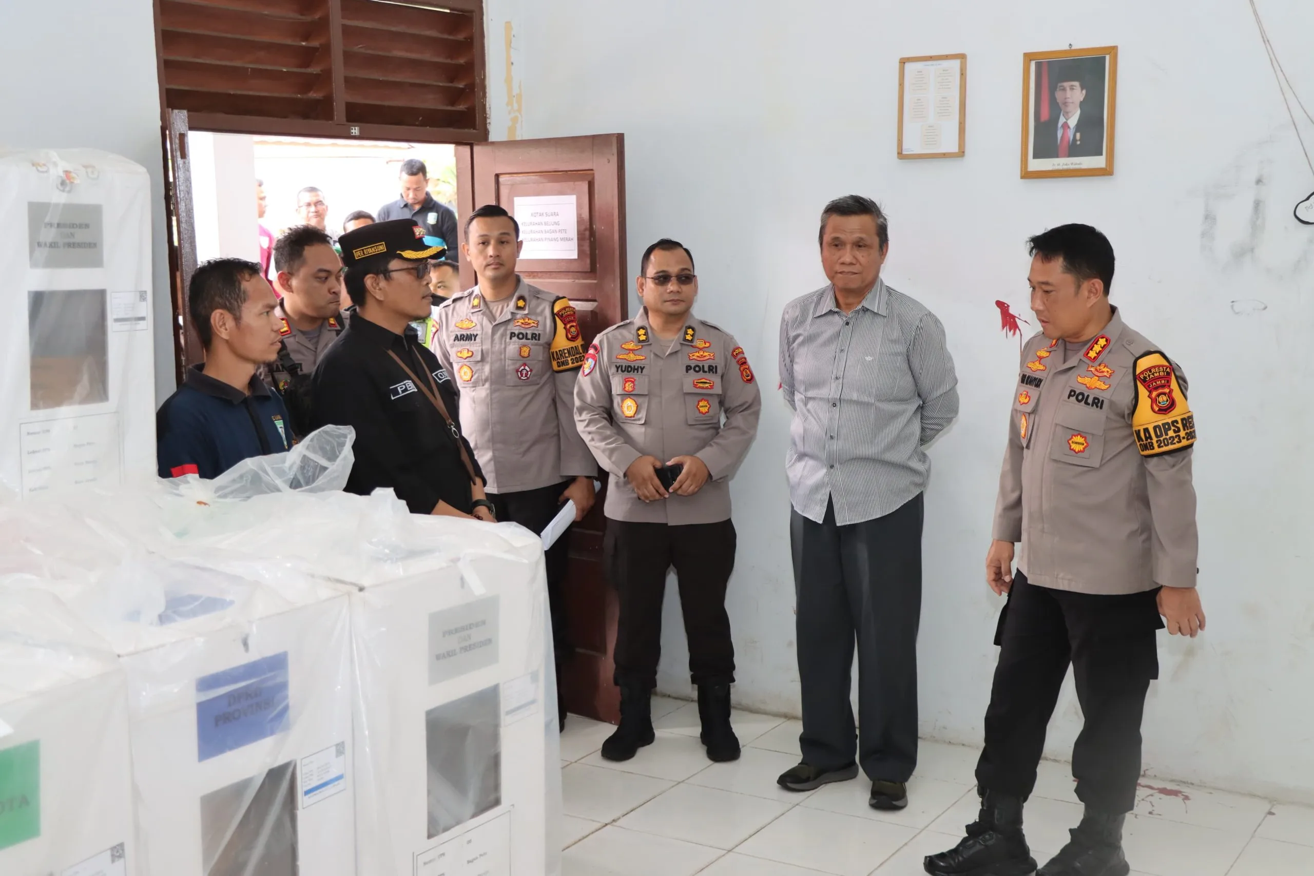 DETAIL.ID, Jambi – Pengecekan dan monitoring gudang logistik tingkat PPK di sejumlah kecamatan dalam Kota Jambi pasca pemungutan dan penghitungan suara pemilu 2024 dalam rangka Operasi Mantap Brata (OMB) 2023-2024, Jum’at 16 Februari 2024.