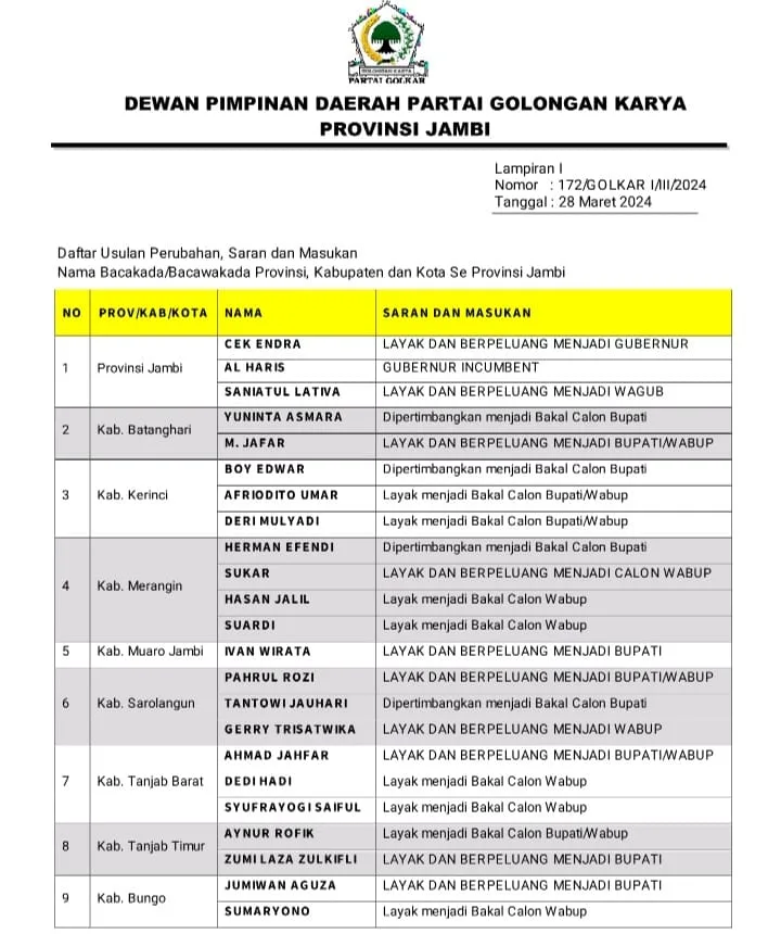 DETAIL.ID, Jambi – Polemik surat usulan DPD Partai Golkar Provinsi Jambi terkait nama-nama Bacakada yang ditujukan pada Ketua Umum DPP Partai Golkar masih terus jadi perbincangan hangat warganet.