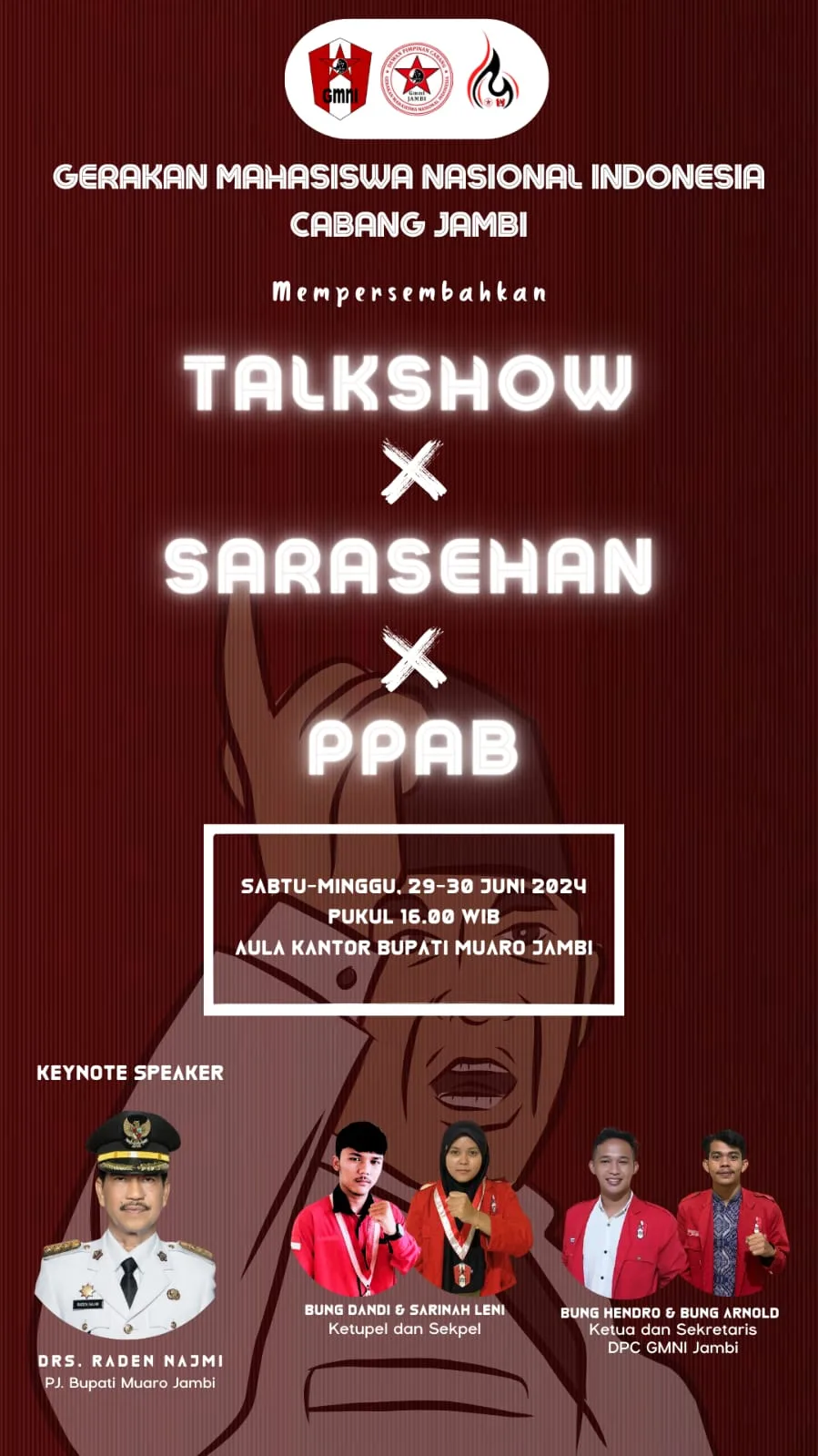 Ketua pelaksana acara Peringatan Bulan Bung Karno GMNI, Bung Dandi Kamis kemarin 27 Juni di Sekretariat GMNI Cabang Jambi menyampaikan GMNI Jambi akan melaksanakan acara Talkshow, Sarasehan dan PPAB Raya yang akan dilaksanakan di Gedung Diklat BKD Muaro Jambi.