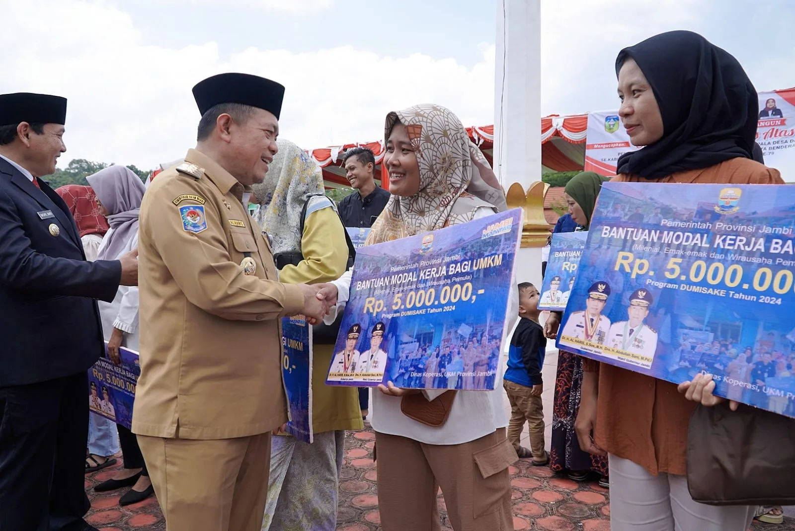 Bantuan Dumisake modal kepada 113 pelaku UMKM dan 30 kelompok tani hutan ini diserahkan Gubernur Al Haris usai pengukuhan perpanjangan masa jabatan Kades dan BPD di lapangan Gunung Kembang Sarolangun.