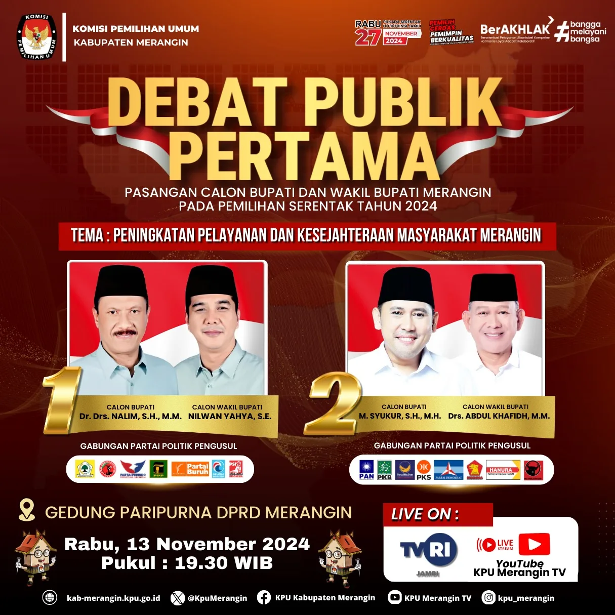 DETAIL.ID, Merangin – KPU Kabupaten Merangin akan menyelenggarakan debat publik terbuka pasangan Calon Bupati dan Wakil Bupati Merangin.