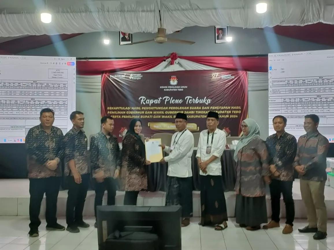 DETAIL.ID, Tebo – Komisi Pemilihan Umum (KPU) Kabupaten Tebo menggelar rapat pleno terbuka rekapitulasi hasil penghitungan perolehan suara dan penetapan hasil Pemilihan Gubernur dan Wakil Gubernur Jambi tingkat Kabupaten Tebo serta Pemilihan Bupati dan Wakil Bupati Kabupaten Tebo tahun 2024 pada Selasa, 3 Desember 2024.
