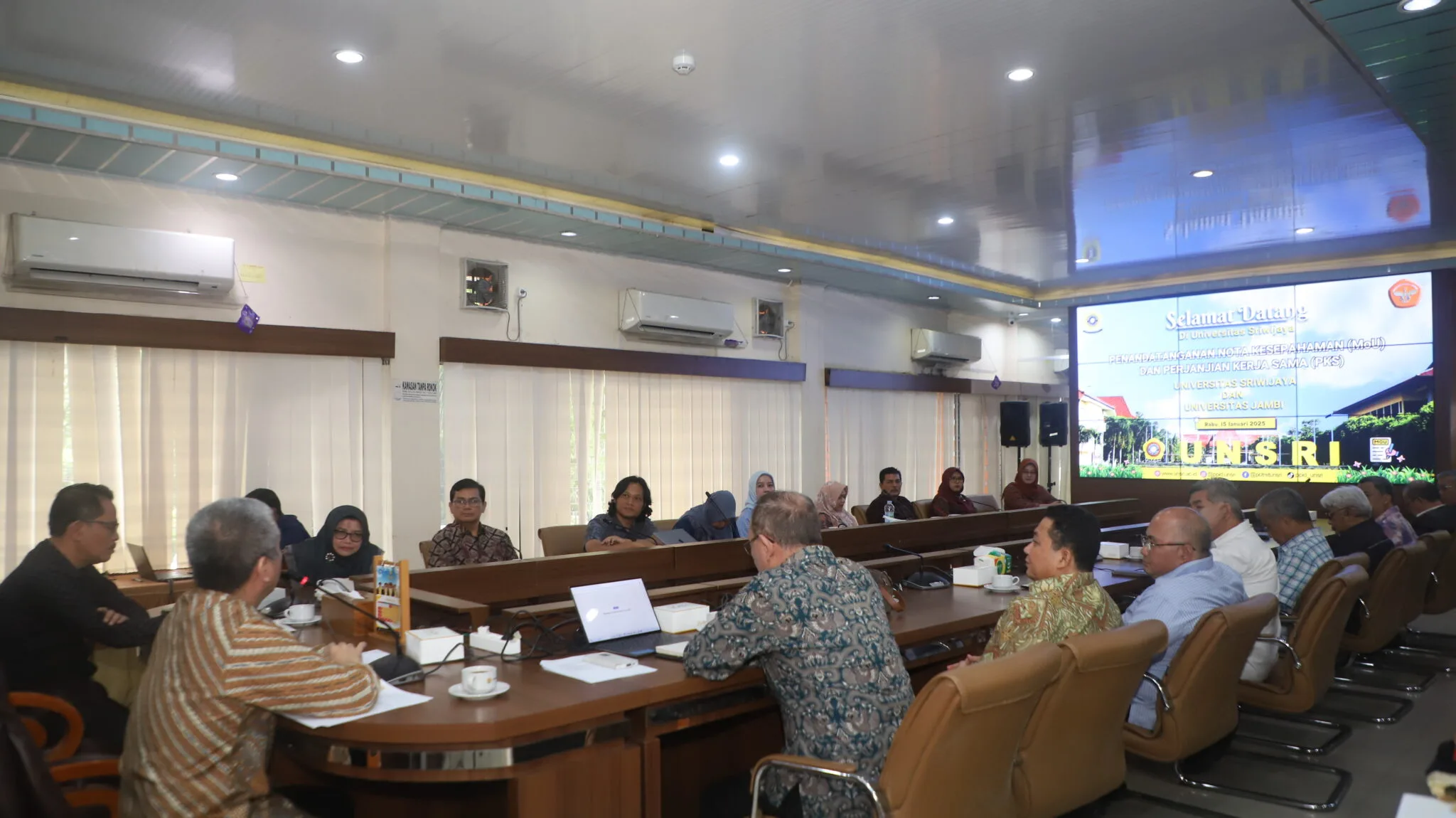 Mendalo – Universitas Jambi (UNJA) dan Universitas Sriwijaya (UNSRI) resmi menandatangani Nota Kesepahaman (MoU) dan Perjanjian Kerja Sama (MoA) untuk memperkuat kolaborasi di bidang akademik, penelitian, dan pengabdian masyarakat. Acara penandatanganan berlangsung pada Rabu, 15 Januari 2025 di Ruang Rapat 1 KPA UNSRI Kampus Palembang.