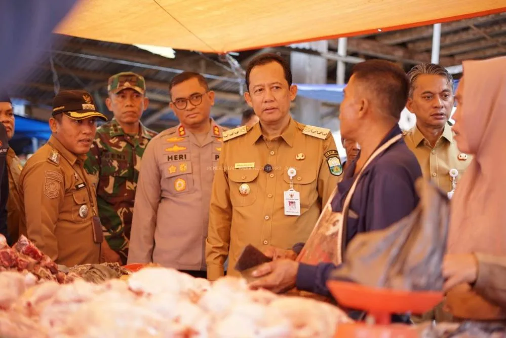 Bupati Kabupaten Muarojambi Bambang Bayu Suseno SP. MM. M.S.i bersama Wakil Bupati Kabupaten Muarojambi Junaidi H. Mahir, Sekda Kabupaten Muaro Jambi Budhi Hartono S. Sos M.T meninjau langsung kondisi keadaan harga bahan pokok menjelang hari raya Idul Fitri.